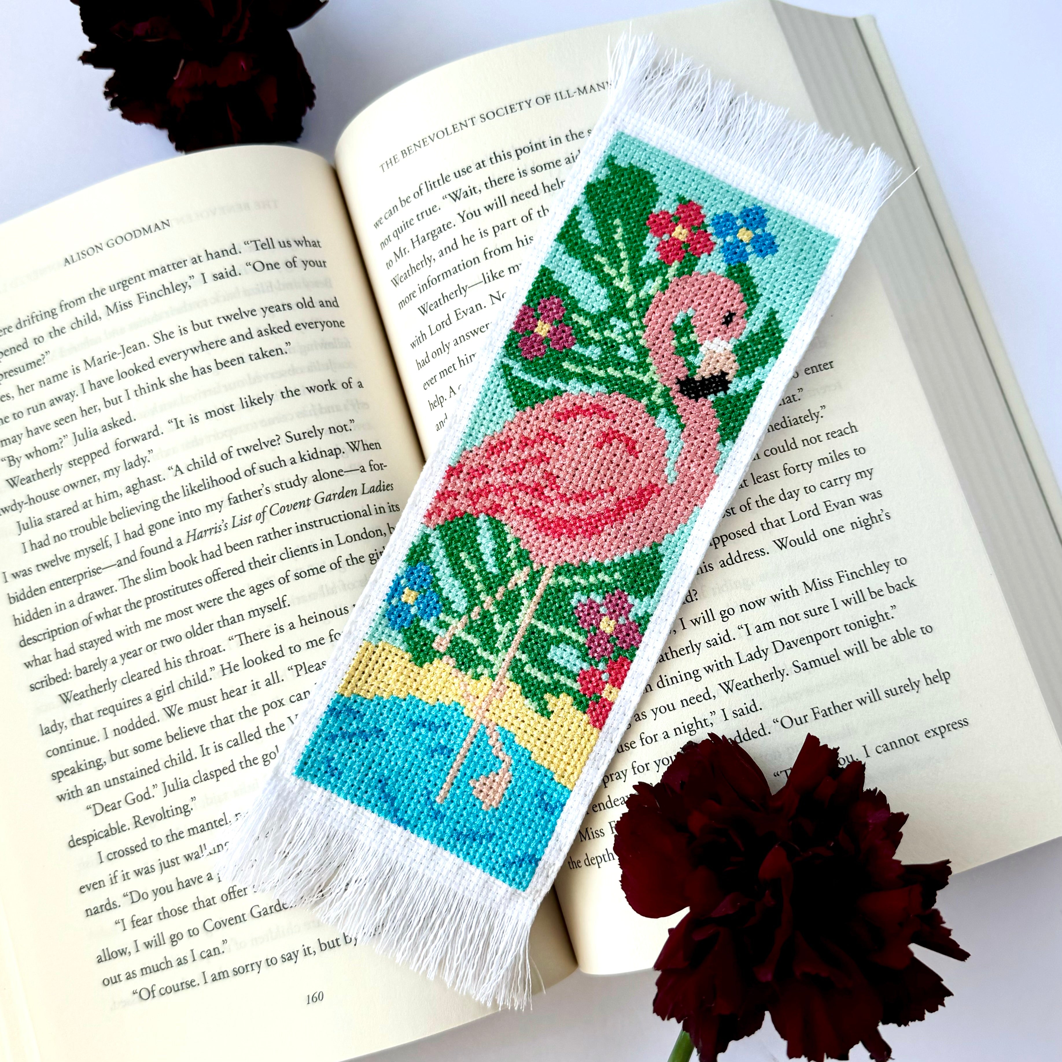 Step into the tropics with our Tropical Reads Cross Stitch Bookmark Kit. Imagine the warmth of a sunny beach as you create this vibrant, colourful bookmark that features a pink flamingo wading through water, surrounded by lush monstera leaves. The tropical feel continues on the back, with bright flowers and leaves.